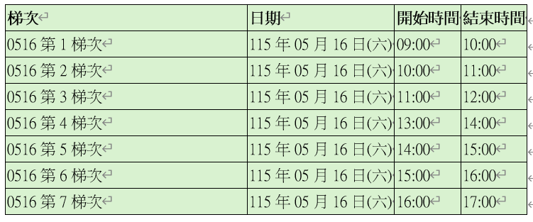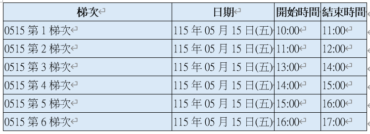 面試梯次分配表(每梯次面試時間約60分鐘):請於面試梯次開始前20分鐘辦理報到。
