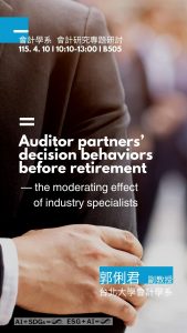 115.04.10.台北大學會計學系郭利君副教授「Auditor partners’ decision behaviors before retirement—the moderating effect of industry specialists」